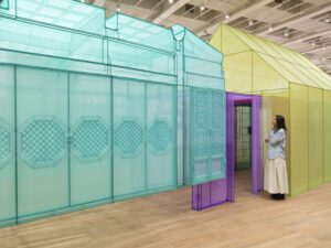 VR, the medium that puts viewers literally inside new and unfamiliar situations, seems like the perfect next step in this trajectory, and is it through this outlet that she has been able to expand and amplify the analogue works in new and pioneering directions. This has been furthered by collaborating with Drive Studios, who helped to develop original sound design and glacial animation to intensify the experience of the display. Bringing these previously two-dimensional pieces to life gives audiences the ability to experience the illustrations in the same way they might a sculpture or an installation. Brightly coloured shapes shift and whirl in abstraction, offering an innovative and eye-catching set of works, which provide an alternate and progressive reality to the frenetic streets they overlook.