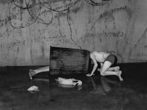 The gallery contains a clever pull-out wall, which features two more of Klein’s black and white abstractions, which are photographic renditions of experimentations of light movements. These works, which are similar Man Ray’s “rayographs”, show Klein’s artistic playfulness that can be identified throughout his works. This type of play on light was incorporated into Klein’s fashion photography, as seen in the stunning work, “Dorothy blowing smoke light rings”.