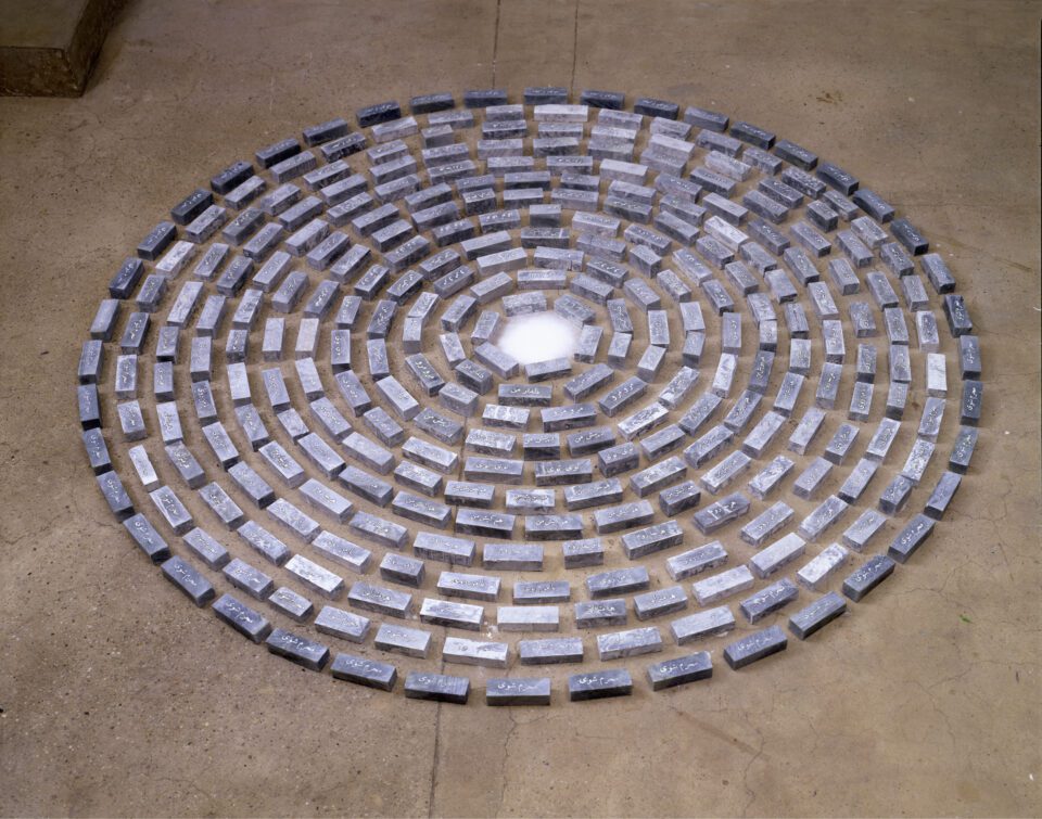 The sculpture, Rumi, The Book of Shams e Tabrizi (In Memory of Mahin Tajadod) (2005), is based on a love poem by the Persian poet Rumi found in his seminal text of the same name. The work is homage to Mahin Tajadod, a scholar who opened the doorway to Persian poetry for the artist. Comprising 12 concentric circles, where each one refers to a verse from the poem, the work inscribes a single word from the verse on each brick of the circle. The repetitious pattern, textually and materially resounds off one another, creating a visual and verbal echo that prevails over the imposing space of the gallery. The salt in the center of this sculpture contrives biblical associations, metaphorically signifying purification and permanence. The intentional syncretism channeled in Kami’s work, references a universal spirituality that transcends religion.