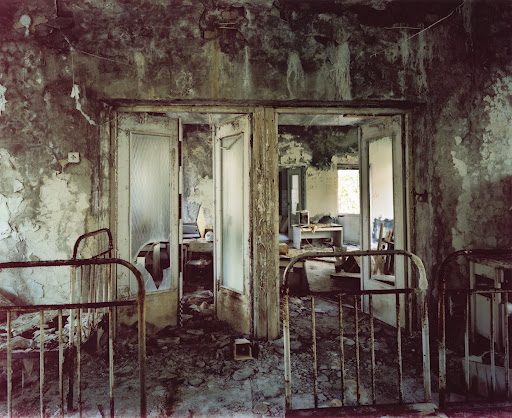 Atomgrad (Nature Abhors a Vacuum) (2010) is a suite of eight photographic prints depicting deserted interiors from the abandoned town of Pripyat. Books remain on shelves and desks, bed frames remain intact and once-exquisite parquet floor lies on the ground like rubble. A yardstick appears within each image and is a recurring motif throughout the exhibition. These objects of measurement – functional yet obsolete – act as a marker of scale and order, alluding to the tensions between association and analysis, memory and material fact.