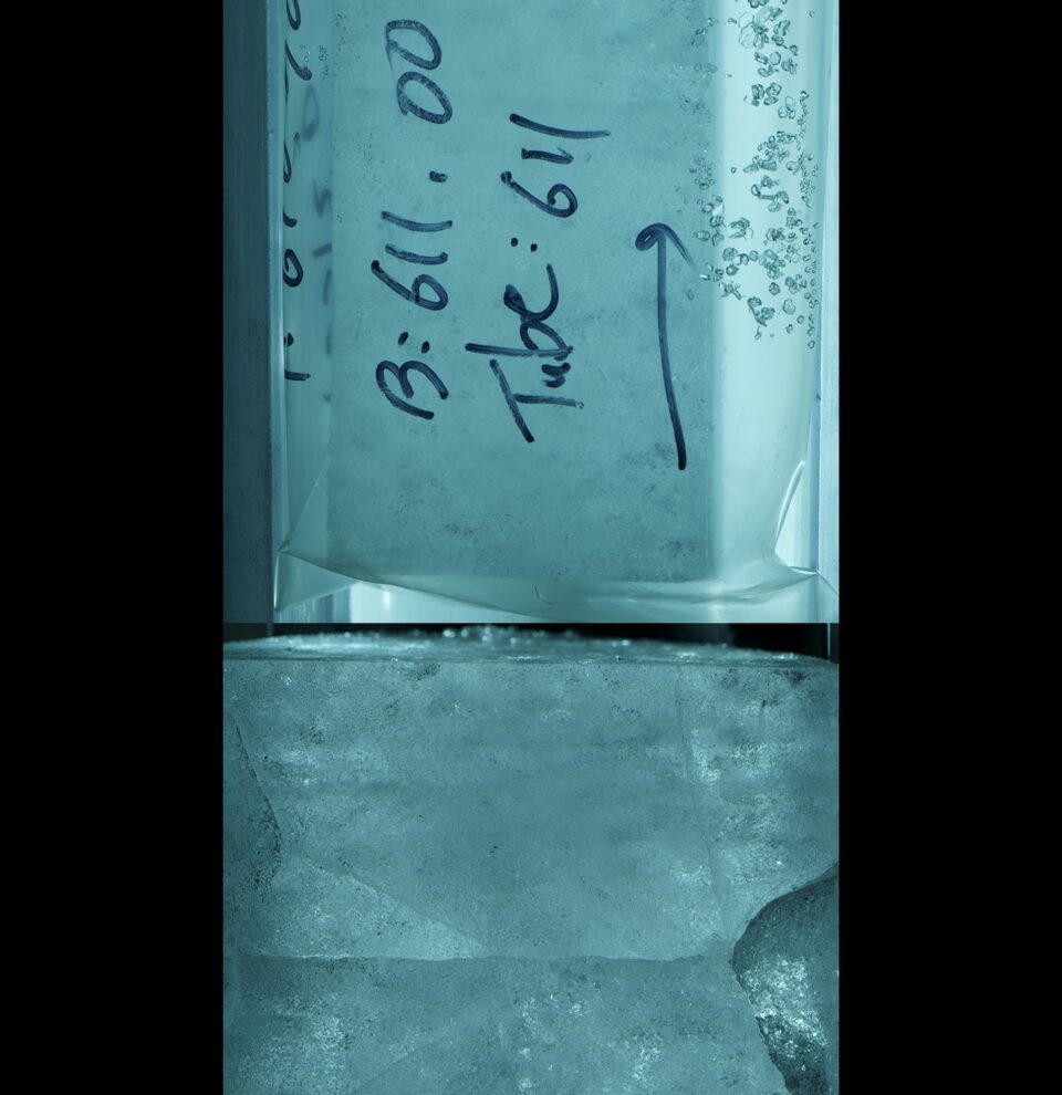 Most of us are familiar with the idea of tree rings, which grow concentrically each year and reveal the plant’s age, as well as past environmental conditions. Ice operates a similar system, preserving time vertically, with each annual layer of compacted snow carrying bubbles of gas and air that record the makeup of the atmosphere at a point in time. Chemical analysis can match these gases to historical events, like volcanic eruptions. Dust and debris are, also, indicators of seasonal variation and regional conditions.