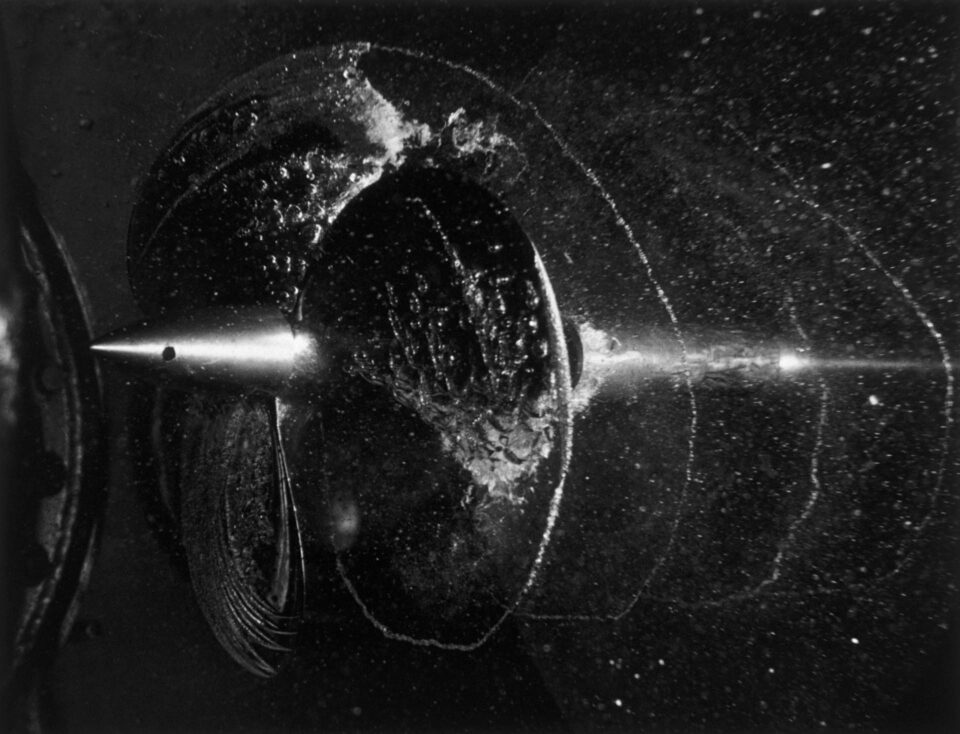 In 1932, Edgerton captured his first “art image”: a high-contrast photograph of water flowing from a tap. He continued this practice for decades, immortalising moments like a golfer’s swing or a milk drop hitting a table. By 1937, one of Edgerton’s milk-drop photographs, titled Coronet, had been included in the Museum of Modern Art’s first photography exhibition, cementing Edgerton as an influential figure in the medium. It’s an instantly recognisable composition, and a later colour version from 1957 is listed as one of TIME’s 100 Most Influential Images of All Time. Another of Edgerton’s most famous pictures captures an apple being pierced by a .30 caliber bullet. Freezing Times gives deeper insight into these iconic shots.