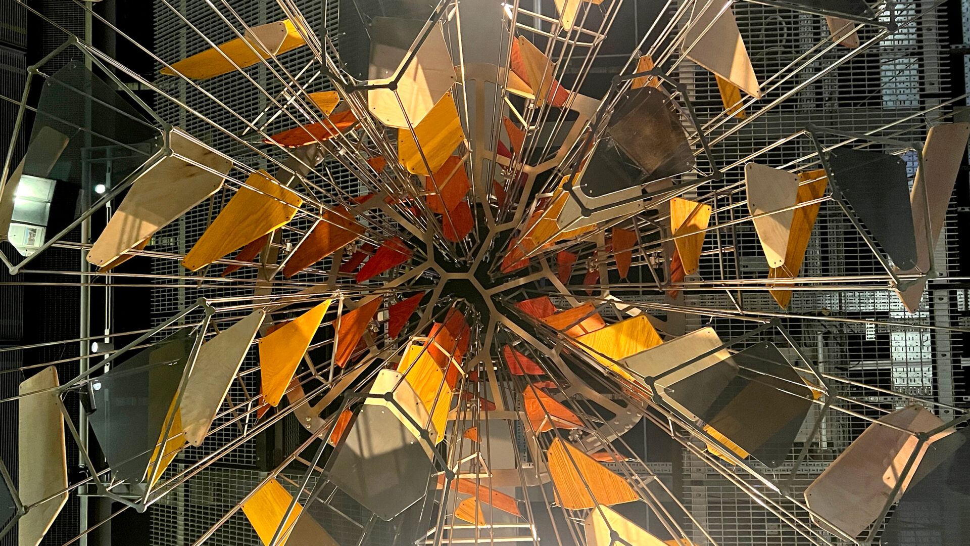 AC: Spiral structures are seen in nature and the form is significant across many cultures throughout history. Often referred to as the pattern of existence, they suggest an introspective spiritual journey whilst their unfolding, unfurling, emerging and blooming nature speaks to an outward connection with the macrocosm. The work has a phyllotaxis spiral combined with a voronoi algorithm that can be seen in tesselating soap bubbles or plant cell cross sections. We wanted to mimic this form from nature but in a constructed sculptural object – a technological mimicry. The radial outward and inward motion needed an origin or focus point from which the movement could emanate. Conceptually, this origin point or the Aristotelian “prime mover” / “the unmoved mover” echoes some of the semantic references that we wanted to make in the work. However, the title of the piece contrasts this western view and poses questions around our homocentricity to say that we are part of a larger system, a larger universe. Here, we are “only breath” within one cycle. We incorporated 50% “one way” mirrored panels into the work in reference to light and solar reflective arrays as our (the planet’s) main source of energy, so the end panels were made from repurposed materials that were surplus from a previous project. In the closed position, these concave mirrors reflect the viewer. This creates is a moment for us to think on our own roles and responsibilities in the energy revolution.