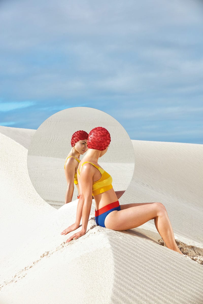 The artist was first featured in Aesthetica for Issue 71, with the Possibilities 2 series providing a multitude of compelling perspectives. Bright blue skylines cut across sand dunes. Boldly dressed figures make fluid shapes. Large mirrors reflect their silhouettes. There are surreal elements dotted throughout the collection, which is featured below. Marble notes John Rawlings, Man Ray, Viviane Sassen, Harley Weir, Erwin Blumenfeld and William Klein amongst his influences.