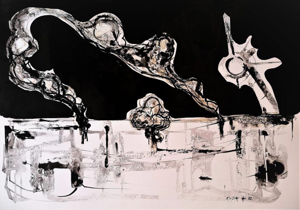 The artist uses this technique to engage with pressing contemporary themes like identity, environment and the intersection of tradition and modernity. He states: “My practice uses drawing as an ethical and political instrument, mapping attention, violence, and care across inner and social landscapes. Through minimal gestures and sustained observation, I question power, authorship and visibility. The work insists on responsibility: to history, to the present moment and to the act of looking itself.” His bold swirls of black ink have a confident immediacy, described by critic Jeffrey Grunthaner as “an expressive seismograph.”