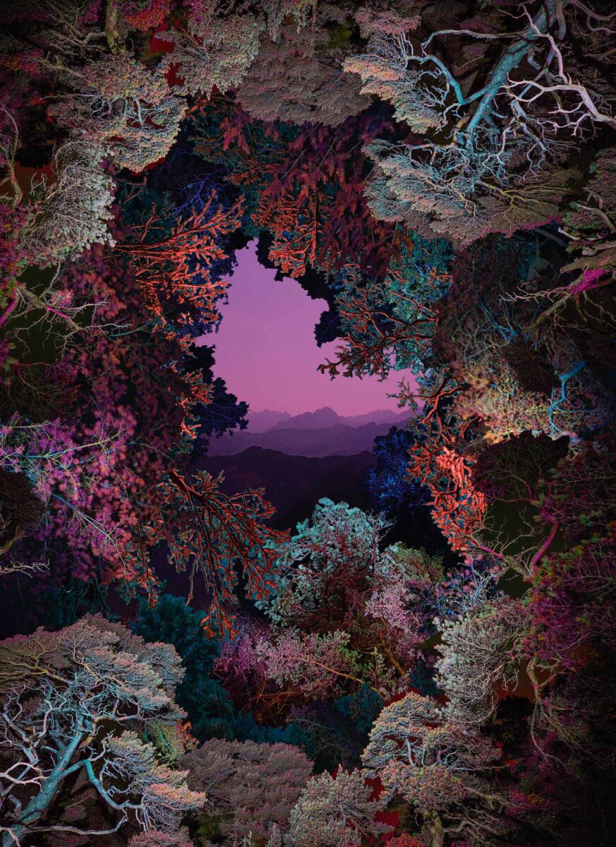 Radiant Horizons | Linda Westin brings scientific methods into her hyperreal work, presenting multilayered forest canopies that glow blue, pink, purple and red.