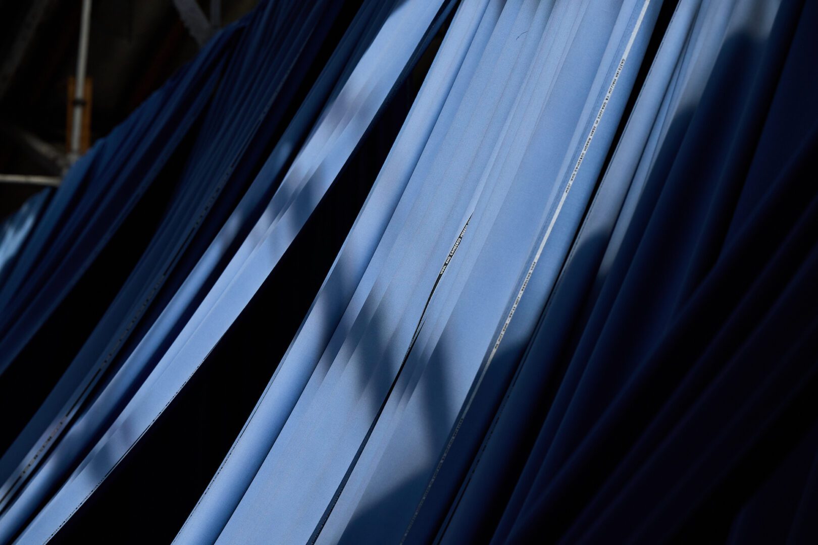 AH: Wool – raw and woven – is key to the project and the district. Towards the end of the former spinning room, stretching the width of the space, is a large, blue wool and mohair curtain composed of individual widths of woven yardage. The front-facing sections drape and split around the joints in the roof’s overhead structure and then extend long fingers into the space in irregular lengths – tethered with wool rope and weighted by rounded stones on the floor. Although this beautiful cloth from William Halstead’s is finely finished with contemporary equipment, the stones nod to the history of warp weighted looms that used stones to hold threads in tension. The back side pools slightly on the floor, forming a more conventional looking curtain. Openings between the selvedge edges read: We Will Sing, Salts Mill, Bradford 2025.