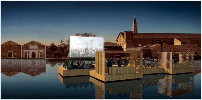 Archipelago Cinema, a floating auditorium designed by architect Ole Scheeren, will form part of the official selection of collateral events in the 13th International Architecture Exhibition. This evocative outdoor theatre is set to be located within the old harbour basin Darsena Grande of the Arsenale, Venice’s historic shipyard. This modular raft will act as a mobile stage for public events, including the premiere of the film Against All Rules.