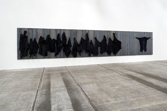 The 18 black wool coats hanging from large meat hooks appear to be shaped into the human form. There is a broken man on the far left, next to him two little girls swaddled in black burkas holding hands while next to their torn childhood joys, women draped in black burkas stand. The figures become misshapen as the installation extends to the right; their bodies become unintelligible. An image perhaps connoting the dissolution of human identity gradually appears before our eyes. The coldness of the iron panels behind the suggested bodies emphasise the challenge posed by the tension between the human body and the object. The site-specific work by Kounellis denotes death and silence just as much as it does the disintegration of society.