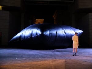 How do human groups react when they face a big danger? On stage, a huge inflatable pillow-like object moves across the stage, like a predator.