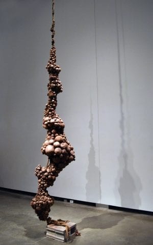 Untitled occupies a seemingly empty area through suspended clay forms, which buckle and blister organically along its vertical support.
