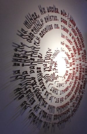 Illuminated by a single spotlight, the elevated texts of Visual Perception in Typography cast ambiguous forms across gallery walls.