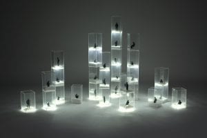 In Uninhabited Island individuals sit alone and are locked up in their own world; contemplating their own universe inside geometric units.