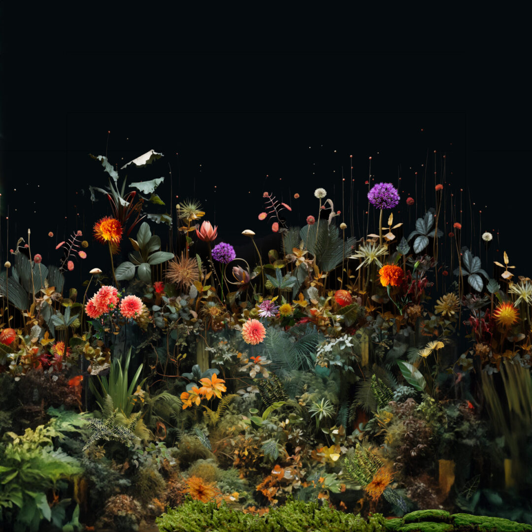 Mary Mattingly’s (b. 1978) extensive photographs bottle the transformational quality of nature. The artist drew inspiration from a moonlit walk around Socrates Sculpture Park, New York. Informed by the blossoming and changing flora, Night Gardens considers the wild and shifting relationships between different lifeforms, humans included. Each image began with experimentation, as Mattingley took cuttings, scanned plants and foliage, incorporated fish tanks and mirrors, crafted flowers out of fabric and used digital programmes in the piece’s creation. The works blend the physical and digital realms, using modern technology to bring the age-old majesty of nature to vivid life.