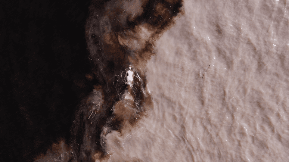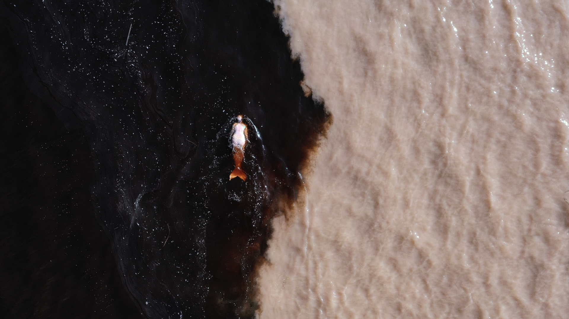 Æqualia (2023) is the third in a trilogy of films featuring an imagined pantheon of feminine deities. The piece was filmed in various confluences of rivers, sites historically used as centres for extraction. In it, the artist embodies a vision of a post-human chimera – part pink-river dolphin, part siren – swimming through the waters of the Amazon Basin. She glides through the six-kilometre confluence where the milk-white Rio Solimões, thick with silts and clays from the high Andes, meets the Rio Negro, darkened by the decay of lowland forests. The sight of the two waters colliding infers the complexity of our reality. It hints at the blending of past, present and future, as well as the destructive forces of capital on the region’s ecology.