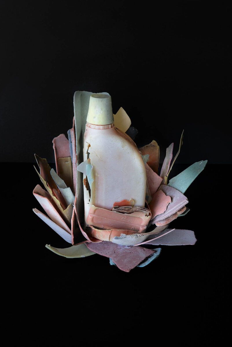 TS: Vanitas is the 17th century style of painting we know from our art classes, which contains collections of objects – de- caying flowers, rotting fruit and snuffed candles – that are symbolic of the inevitability of death. These works on canvas are about transience, and the vanity of earthly achievements and pleasures. Vanitas exhorts the viewer to consider mortal- ity and to repent. The objects I find on the shores, affected by the current, salt water and light, also emphasise the shortness of life, just like the paintings did several hundreds of years ago. In my works, the traditional iconography of mortality, ephemerality and wealth has been traded out for bottles, baskets and bowls: single-use items that are used and then discarded, now only existing as empty vessels of destruction.