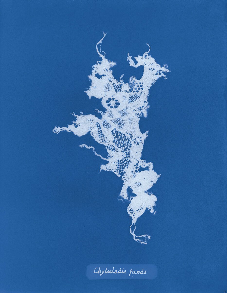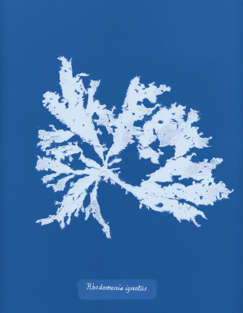 In 2012, Mandy Barker (b. 1964) mistook a piece of material in a rock pool for seaweed. It was a lightbulb moment and, in the years since, the artist has recovered over 200 examples of discarded fabric from around the coastline of Great Britain. Now, these clothing fragments – jackets, trainers, football shirts, fancy-dress outfits and underwear – are presented as cyanotypes in a carefully-bound volume. Barker is paying homage to one of the most important figures in photographic history: Anna Atkins (1799-1871). She was a Victorian botanist who used the cyanotype process to immortalise different species of British algae as Prussian blueprints. Atkins’ compendium, Photographs of British Algae: Cyanotype Impressions (1843), is widely considered to be the first ever illustrated with photographs. Barker has meticulously replicated the original publication, substituting botanical specimens for found garments or fibres. Shockingly, many of the pictures are nearly indistinguishable from Atkins’ early organic forms.