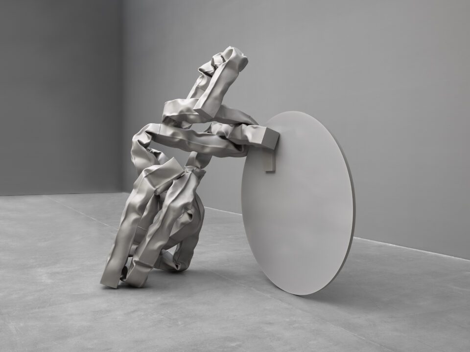 The exhibition is presented in a loose reverse chronology of Bove’s career, winding backwards in time from new sculptures on the museum’s lower ramps to drawings and installations made in the early 2000s at the top. As the viewer progresses upward, the physicality of the artworks gradually lightens, with large-scale steel abstractions giving way to compositions formed from fragile beads, feathers and thread. This feeling of ascension is echoed in the gradated grey paint that has been applied to the spiral ramp’s back wall, which progressively shifts from dark to light. At the heart of the experience, six polished aluminum disks rise through the rotunda in a vertical column. Originally created as elements of a group of sculptures commissioned for the nearby Met’s facade in 2021, the reflective disks activate the Guggenheim’s geometries, drawing the viewer’s eye upward to the museum’s skylight.