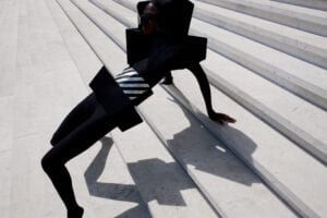Photographer Jackie Nickerson wraps the human form in elaborate, unwieldy costumes made of waste plastic, exploring ecology and technology.