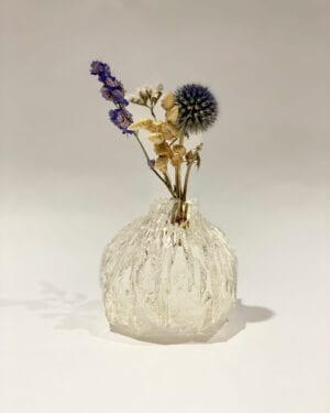 Dried blooms emerge from blocks of ice. Pampas grasses are encased in glassy shards. These are the works of London-based Angela Yanjun Chen.