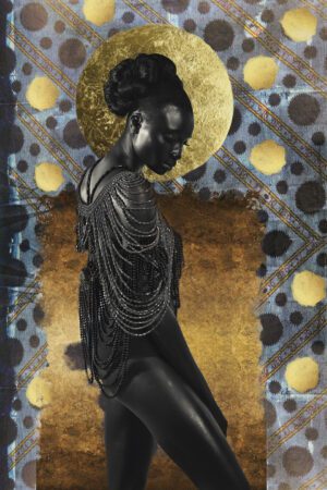 Kate Theo places characters in their own surreal worlds. Concentric circles hover like ellipses alongside balloons and golden cages.