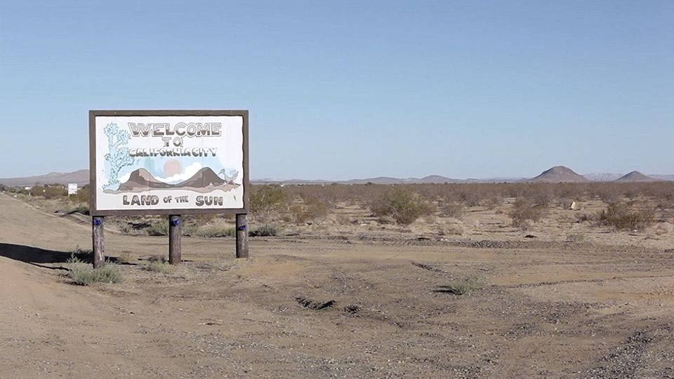 A standout work of video art by Berlin-based artist Niklas Goldbach is Land of the Sun. Filmed in California City, a dream-city conceived in 1965 by sociologist-cum-entrepreneur Nat Mendelsohn in the Mojave Desert with the aim of being crafted into an artificially architected utopia—this American Dream is now dead. As we witness the barrenness of the scenes, a couple who continue to live there, seemingly alone and clutching to this faded ideal amidst 300 kilometres of abandoned homes and shops, desert dust and reptiles, narrate the reasons why they love living there (there’s no traffic jam, there’s no line up). What begins by making us laugh slowly becomes despair as the follies of hubris and human dreams, beside the enormity of biology’s reality, hits a universal nerve of terrible powerlessness and loneliness.