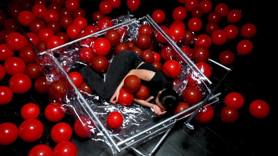 Her installation, Coded Intimacy (2025), is a prime example. The moving-image piece, on view as part of An Authentic Delirium, confronts the impact of human–machine relationships, using a cube of red balloons as a metaphor for manufactured connection. The installation stages a “visible fiction”: the inflated forms do not conceal their emptiness; their fragility is apparent. Yet participants engage regardless. Viewers watch as characters interact with the spheres, wearing long gloves to symbolise the mediated nature of online interaction. Here, acts of tenderness become procedural, with every gesture following a protocol – a so-called “algorithm for affection.” Each balloon delivers controlled feedback, until, eventually, it deflates, disappears, or withholds satisfaction, “echoing the collapse of AI companionship.” When this happens, there is no revelation – only absence. The exchange ends, yet the impulse to continue lingers.