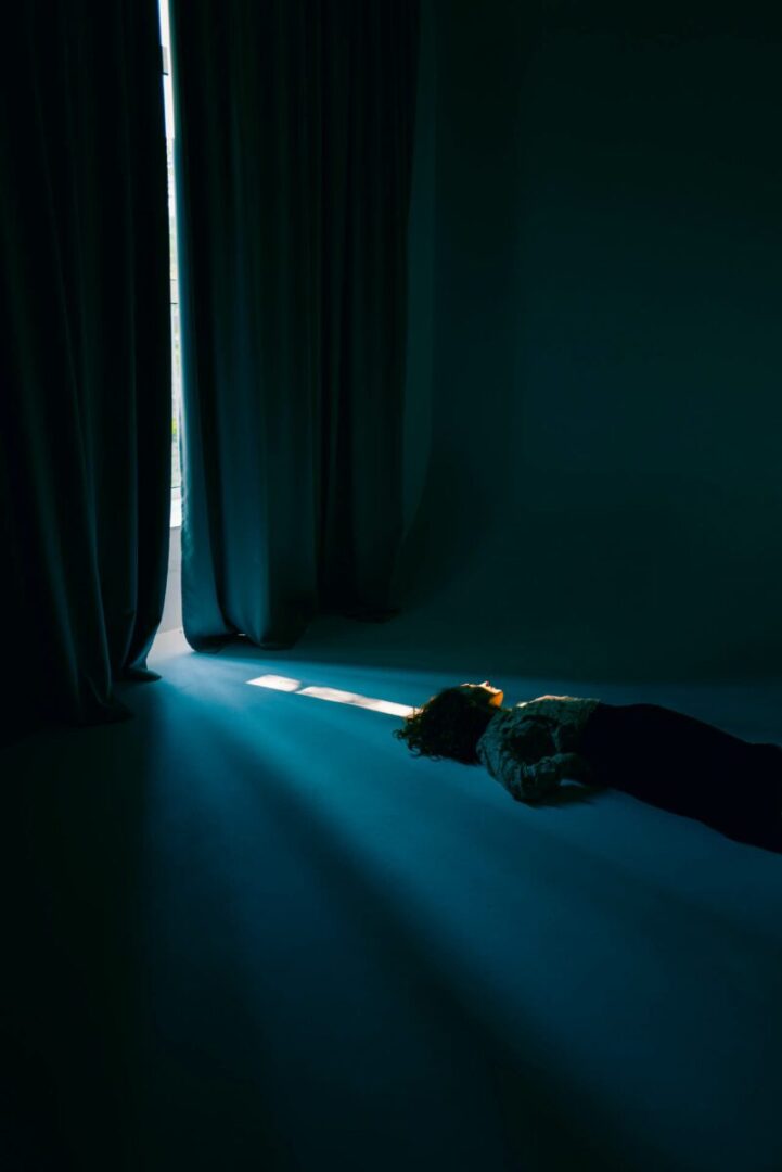 It will come as no surprise to readers that Polina Washington’s (b. 1991) background is in cinematography. Light and colour are crucial to her body of work. In the following pages, complete stories are communicated through a singular sunbeam, or door left ajar. Viewers may be reminded of Roger Deakins (Blade Runner 2049, Sicario), known for his command of blues and oranges, or the room-sized light and space installations of James Turrell. These pictures are delicate and carefully crafted, delivered with precision and attention to detail. Some characters shade their eyes from the glare of an artificial sun or open window, whilst others lie back, bathing in warm shafts of red, white and yellow. Washington was born in the small city of Veliky Novgorod, Russia, and later studied to be a Director of Photography (DoP). Now, she shares skills with others, teaching students to work with, rather than against, their fears.