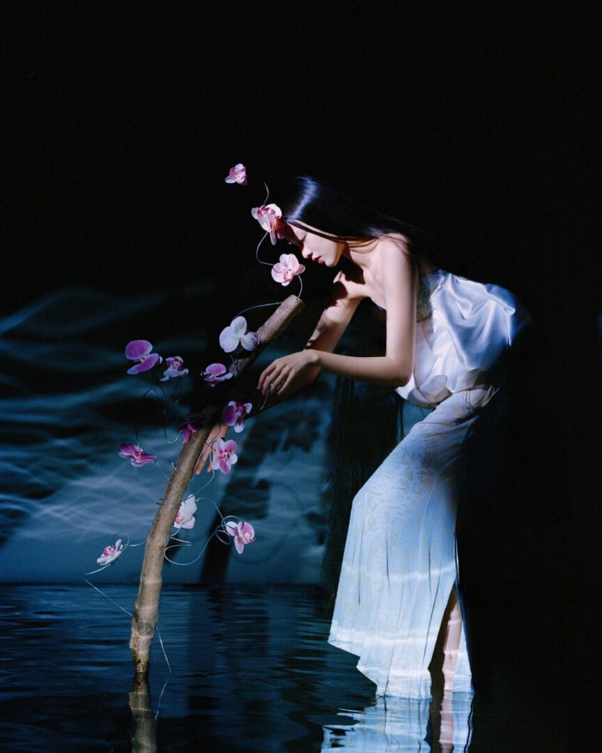 Psychology, femininity, gender, technology and the body. These themes are at the heart of Han Yang’s practice. The London-based photographer, visual artist and creative director combines elements from abstraction, Chinese philosophy, fashion, posthumanism and surrealism to build pictures that are rich in emotional depth. Her close-up portraits use visual metaphors – like broken eggs, or butterfly wings – alongside writings from Buddhist text The Heart Sutra, to explore what it means to be vulnerable, yet resilient, amidst personal and global turmoil. Elsewhere, subjects stand next to withered trees or cherry blossoms in shallow pools; the concept is to examine the connections between people, plants and environments. All of this is executed through a distinct visual style. Han Yang consistently pushes the boundaries of genre, drawing the viewer in via symbolism, mystery and attention to detail.