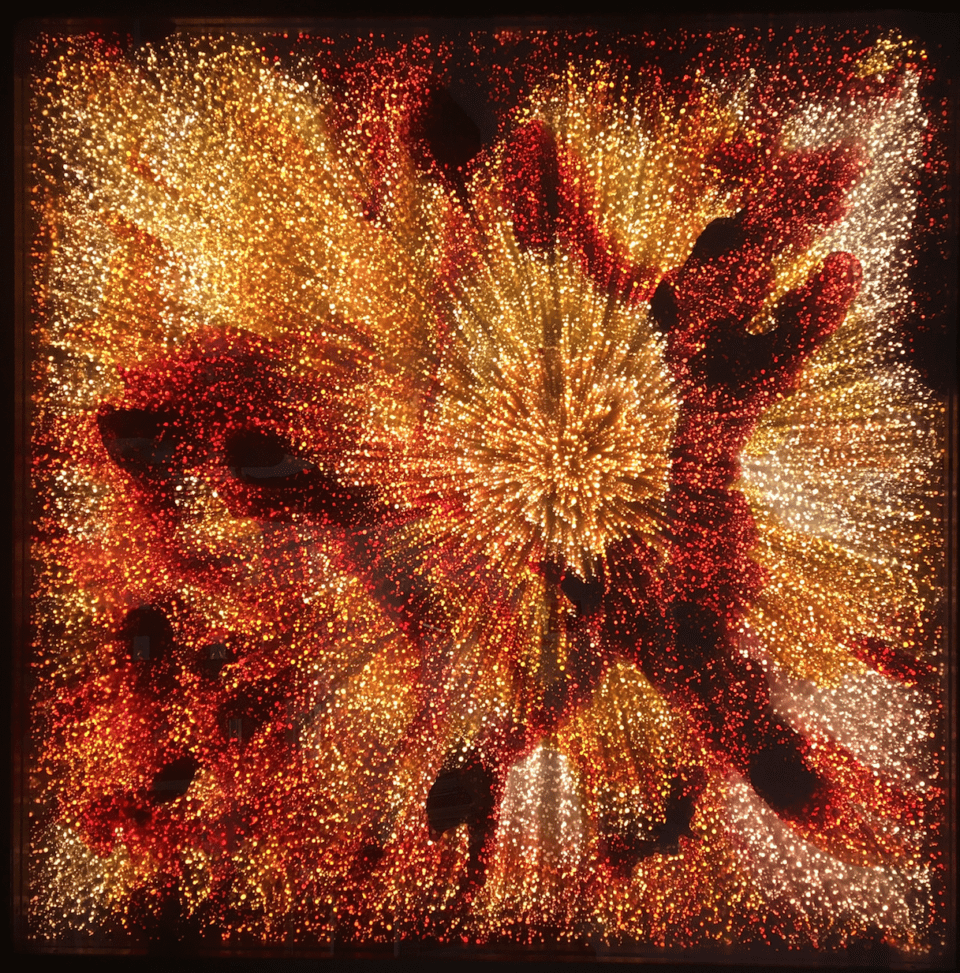 3. Ivàn Navarro, Shrapnel V, 2020. LED, glass paint, wood, sand blasted mirror, one-way mirror and electric energy. 121.90 x 121.90 x 15.34 – 48 x 48 x 6 in. © Courtesy Templon, Paris – Brussels.