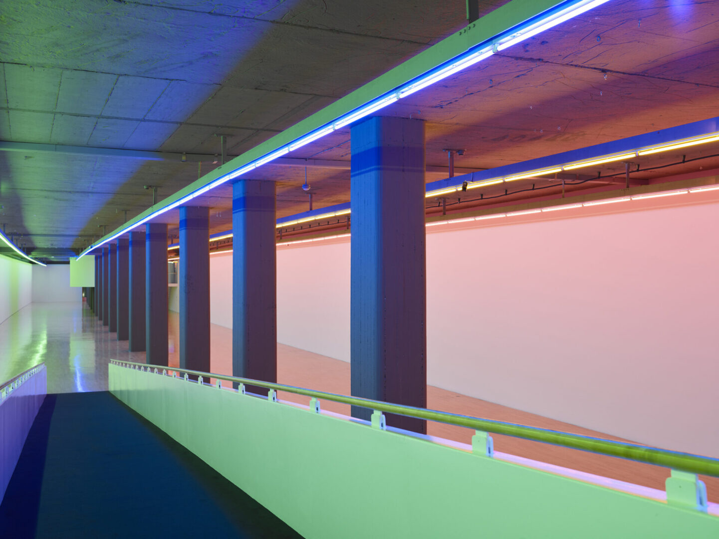 The Kunstbau exhibition hall, part of Lenbachhaus Munich, was one of these spaces. It opened in 1994, with designers Uwe Kiessler + Partner taking inspiration from a nearby subway station. In March of that year, the Lenbachhaus received a fax from the Dan Flavin Studio: a minimalist drawing outlining the conceptual framework and technical instructions for installing fluorescent lamps on the Kunstbau’s lighting track. It was to be one of Flavin’s final “situations”, created just two years before his death in 1996. The result, untitled (for Ksenija), is a prime example of Flavin’s continued engagement with architecture. It is now a permanent part of the Lenbachhaus collection, and is being shown for the tenth time in 2025.