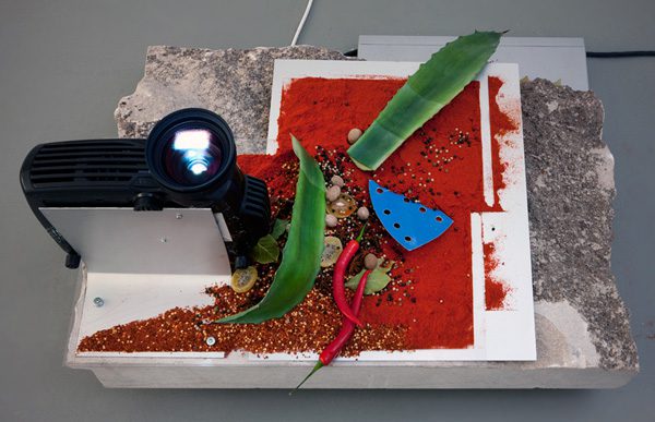1. David Jablonowski, Screenshot 2012, Projector, granite, offset printing sheet, aluminium, spices, leaves, 50 x 82 x 66 cm, Courtesy the artist and Galerie Fons Welters, Amsterdam, Photo: Gert Jan van Rooij.
