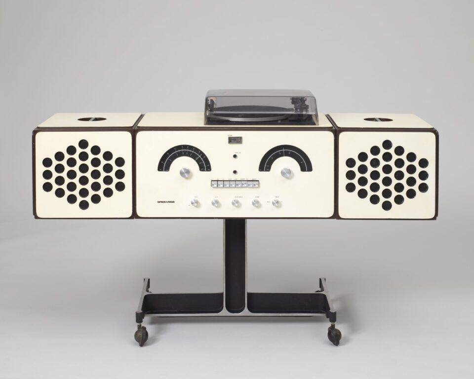 3. RR-126 Radio-Phonograph, 1965; Designed by Achille Castiglioni (Italian, 1918-2002) and Pier Giacomo Castiglioni, (Italian, 1913-1968); Manufactured by Brionvega, S.p.A (Milan, Italy); Plywood, plastic, aluminum, polycarbonate, electronic components; H x W x D (speakers on sides): 46.5 × 121 × 36.5 cm (18 5/16 × 47 5/8 × 14 3/8 in.); H x W x D (speakers on top): 92.5 × 61.5 × 36.5 cm (36 7/16 × 24 3/16 × 14 3/8 in.); Cooper Hewitt, Smithsonian Design Museum; Gift of George R. Kravis II, 2018-22-96-a/c; Photo: Matt Flynn.