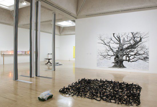 Looking past the models to the far wall of the gallery space Tacita Dean’s Majesty (2006) comes into focus. A four by three metre image of an oak tree, equal parts imposing and sturdy, entwined and spindly. The tree is printed in strong, almost reflective ink, its form stands out dramatically from the background of the image. On close inspection it becomes apparent that the tree has been outlined, the rest of the image smothered by marks of white gouache, leaving only the tree’s stately structure as foreground. Beneath the tree, and echoing its black tangle of limbs sprawls Garth Evans’ Untitled No. 3 (1975). The piece is a rectangle of black rubber spread rug-like on the floor. Made up of short, affixed rubber strips the work hints first at a grid structure, which is never fulfilled. The inbuilt disarray in the connected strips causes the rubber to climb-up from the floor in twists and tangles, only occasionally lying flat.