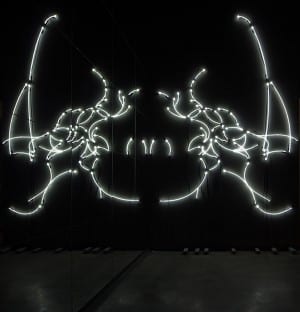 Alfredo Jaar’s (Kindness) of (Strangers) confronts visitors with a complex arrangement of neon arrows which illustrates the movement of people.