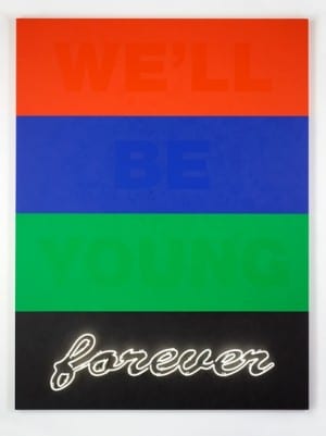 Mounted on fields of primarily black and blue, Deborah Kass incorporates neon lights in her paintings for the first time.