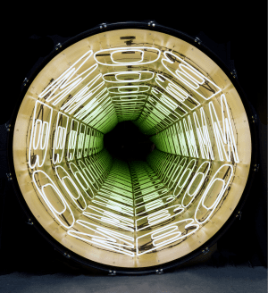 A multi-sensory work, consisting of moving illuminated walls, combines light and sound to expand spatial perceptions.