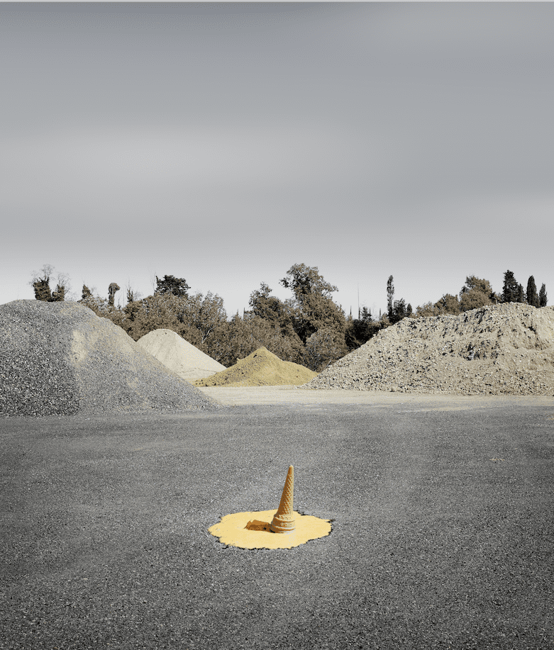 Massimo Colonna (b. 1986) is an Italian photographer, post-producer and retoucher who invents spaces that play with a sense of reality. His captivating portfolio is defined by vast open expanses, all shot on level playing fields. As viewers, we are often asked to gaze across similar horizon lines, considering their similarities and differences, from abundant landscapes to sparse concrete quarries. The Isolation series, for example, features stranded chairs, ladders and rubber rings amidst rolling fields spilling with pink, yellow and green plant life. It’s as if the world has been left to its own acts of rewilding, devoid of human presence. Meanwhile, the Global Warming series takes a stark grey quarry as its setting, with undulating piles of sand, rocks and sediment set amongst stark, browning trees. Ice creams melt into the tarmac, whilst plastic straws protrude from a drying puddle.