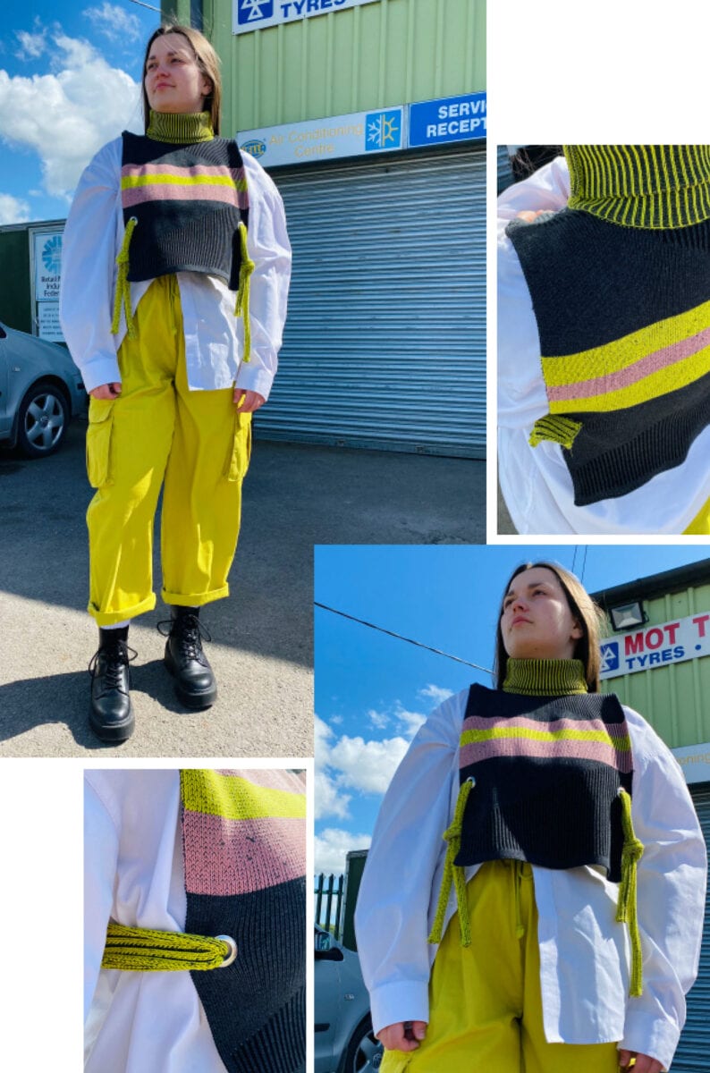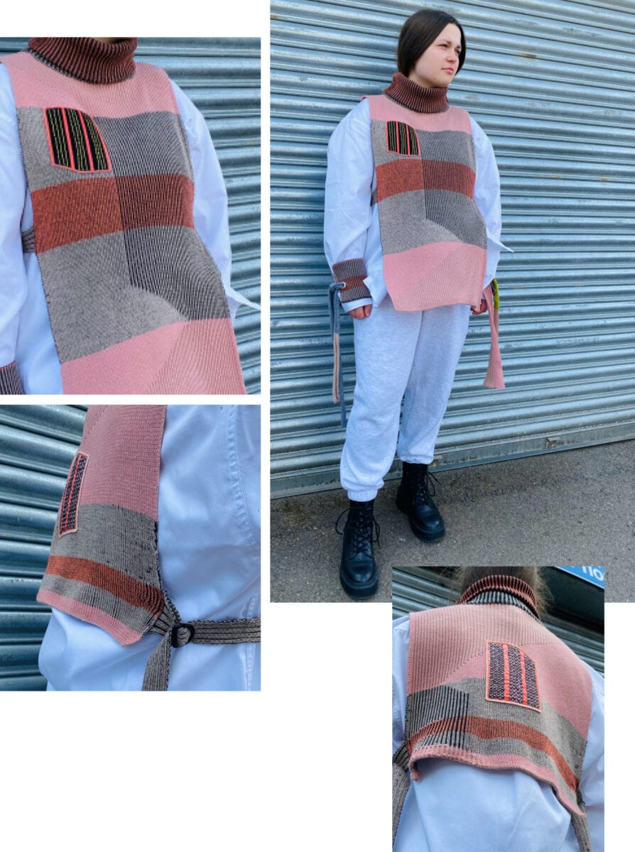 Lennard’s final collection Modernist Patchwork explores the idea of modernising traditional patchwork techniques, taking reference from Spanish architecture and Surrealist artworks. For Lennard, the driving force is to produce fabrics with tactility and lustre – finding beauty within everyday surroundings. To do so, the designer experiments with the juxtaposition of shape, colour and texture, starting with collages that are distinctly graphic, which then feed into the development of knitting process. She works with the belief that our surroundings – however industrialised or neoteric – possess qualities that are inherently beautiful, whatever the definition of that may be, and that these qualities can be displayed in modern media with reference to traditional techniques.