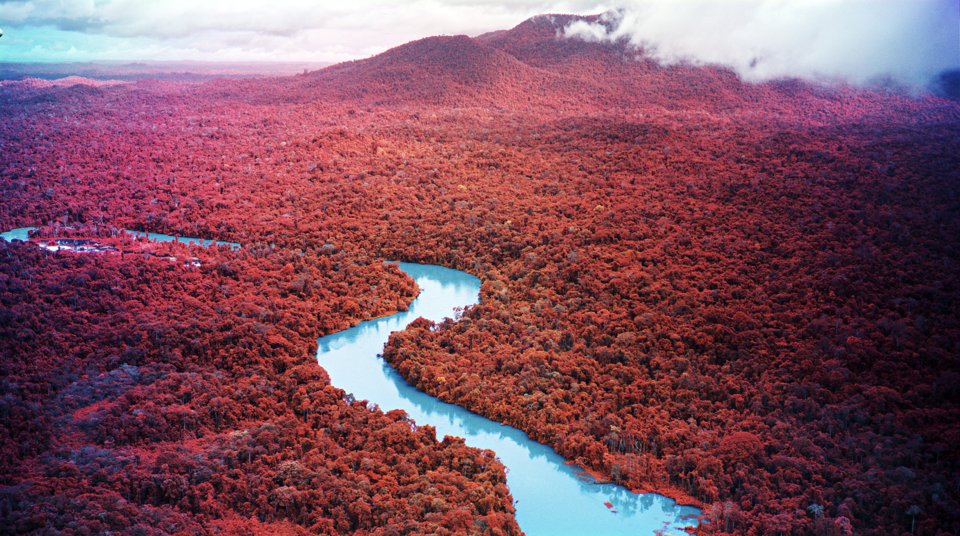 1. Richard Mosse, Still from Broken Spectre, Yanomami Territory I, River Uraricoera, Roraima, multispectral image from helicopter, 2022. © Richard Mosse. Courtesy of the artist nd Jack Shainman Gallery, New York
