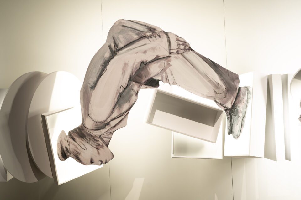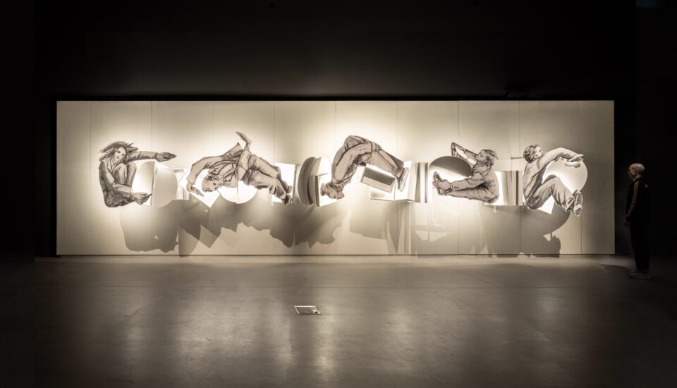 The Everythingists extends this lineage into the present through a set of conceptual provocations drawn from early modernist manifestos and speculative technological futures. Devlin engages with Goncharova and Mikhail Larionov’s 1913 Rayonist Manifesto, replacing stable representation with light, energy and fragmentation. This is placed in dialogue with contemporary reflections on machine–human entanglement, including Cory Doctorow’s centaur and reverse-centaur frameworks, which reconsider agency in technologically mediated systems. These ideas are embedded within an environment of illuminated plywood forms that echo both storage crates and digital packaging systems, suggesting that infrastructure itself has become aesthetic language. The dancer’s body moves through these rectilinear structures as though navigating between classification systems and overflow. What emerges is a space where historical abstraction and computational logic coincide as a frictional encounter.