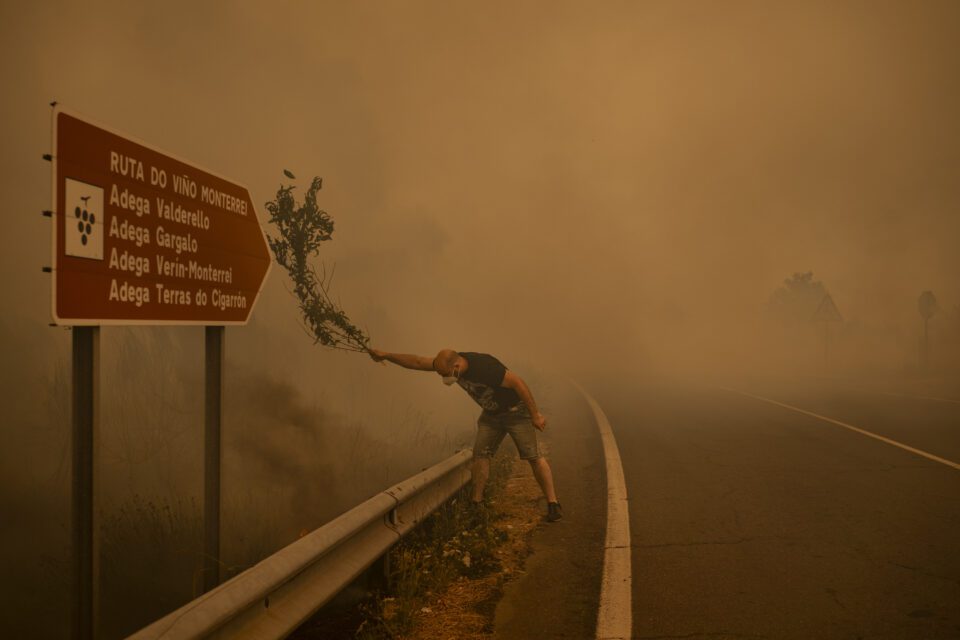 2025 was a record year for wildfires in Europe. More than 200,000 hectares burned across Galicia during Spain’s worst fire season in about three decades. The increasingly severe fires in this region are attributed to drought and heat intensified by climate change, rural depopulation and shortsighted forest management policies, including the widespread planting of highly flammable non-native species. Photographer Brais Lorenzo was born in Ourense, the photographer grew up with the smell of smoke every summer and has documented Galician wildfires since 2011. Here, a man fights a wildfire with a branch in Cualedro. When resources are stretched, residents use whatever is available to extinguish flames.