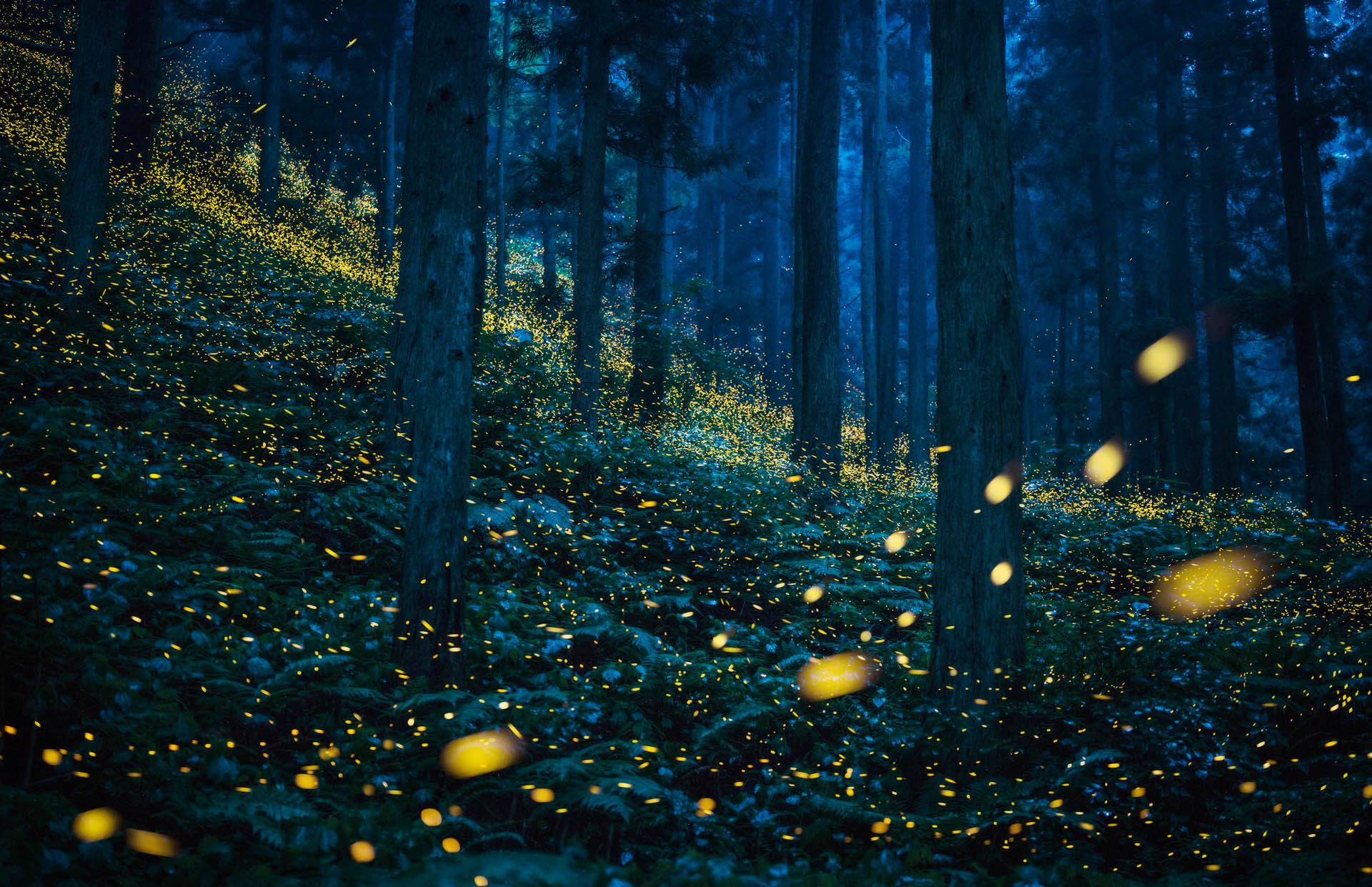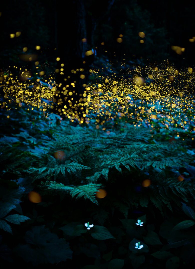 KK: Yamagata is a land of four distinct seasons, with hot sum- mers and deep snow in winter. Fireflies fly around the forest for about 10 days in early to mid-July. This is Japan’s rainy, hot and humid season. They are active every night unless there is a heavy downpour, but the ideal day is when the wind has stopped. Fireflies start to move shortly after sunset – the blue hour. In ancient Japan, this was called the “twilight hour” and was regarded as the time between life and death. That blueness is difficult to see with the naked eye but becomes more pronounced when photographed. Another important factor is to predict which altitude and route fireflies will take, and to capture the parabolic lines they draw. Their unpredictable light trails are determined by a variety of things, includ- ing the density of darkness, the terrain and vegetation. I photograph with long exposures, and the final image is obtained by the light drawn by the fireflies. I consider Himebotaru to also be artists, who are painting with light. The images are made in a dialogue between me, them and the environment.