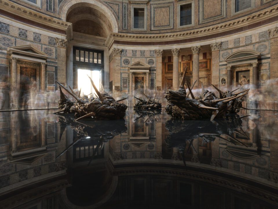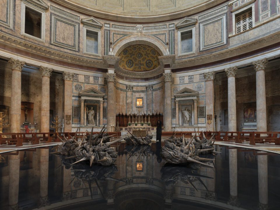 The imagery was strikingly dark. Twisted, pointed bronzes hovered atop a jet-black pool, as if suspended over an abyss. Reflections of the forms, along with the architecture above, rippled across the water, repeating infinitely. Every angle revealed a new interplay of shadow and light. Here, Vockenhuber staged what she calls the “drama of human existence,” a meditation on suffering, fragility and resilience. Yet there is always hope: “The infernal circle of evil is shattered; the crown is broken into seven fragments … The pain is no longer hermetically sealed, but open, shared, so much so that it can be traversed.” In this fragile balance – of darkness and reflection, tension and stillness – the installation transformed the Pantheon into a stage for contemplation. CORONA GLORIAE was a powerful addition to an already-iconic building, and a striking example of how contemporary sculpture can communicate stories across time and space.