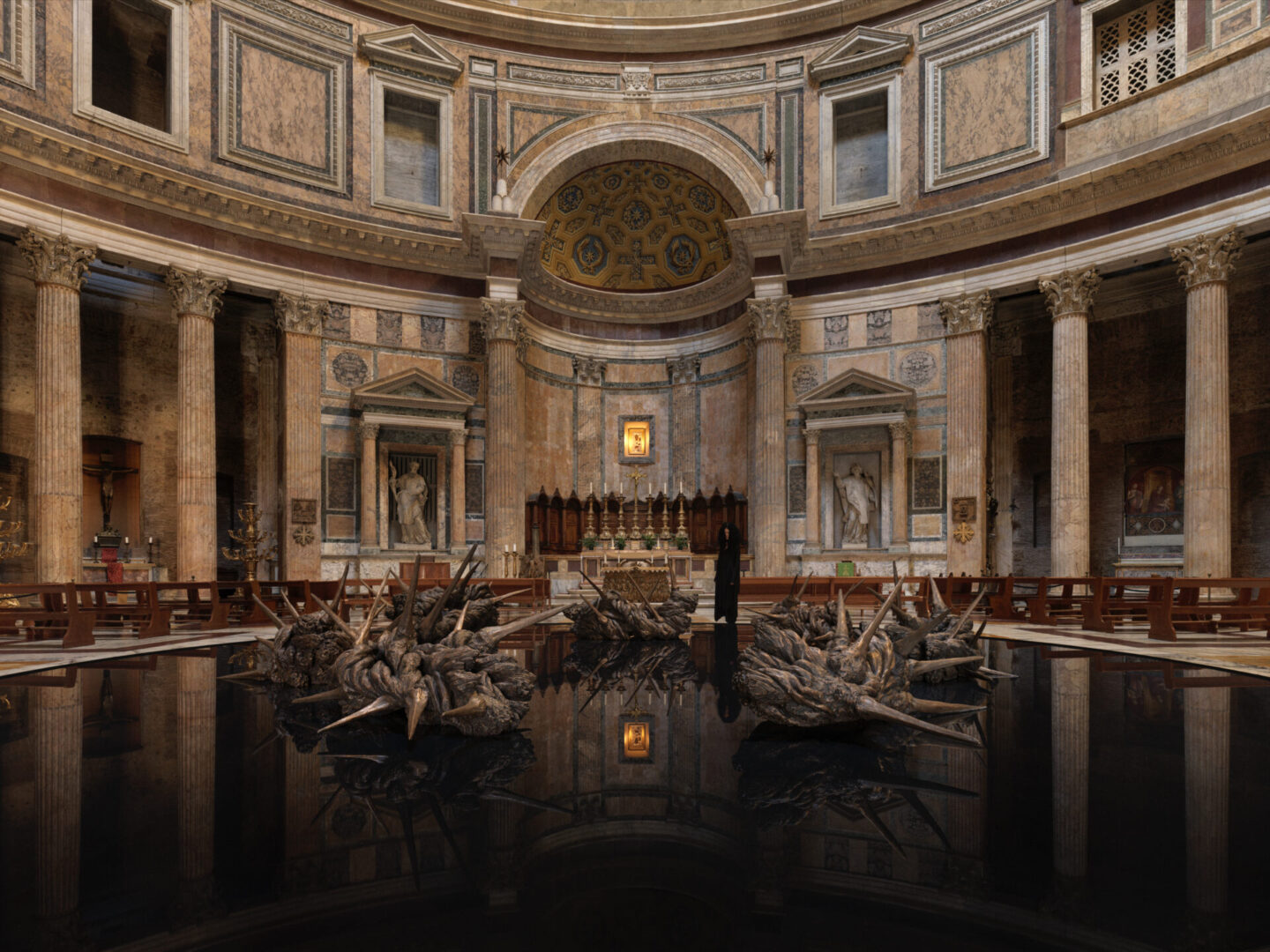 In September, the Pantheon hosted Austrian sculptor Helga Vockenhuber’s (b. 1963) monumental installation, CORONA GLORIAE, as part of the Holy Jubilee Year 2025 celebrations – an event which happens once every quarter-century. Seven larger-than-life bronze sculptures – fragments of a broken crown of thorns – explored themes of pain, redemption and hope within the sacred space. A version of the work was first presented at the Basilica of San Giorgio Maggiore in 2023, coinciding with the Venice Biennale. For the Pantheon, the installation was reimagined in site-specific dialogue with its architecture.