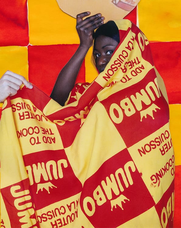 Elsewhere, a stock cube inspires Italo-Senegalese artist Adji Dieye’s (b. 1991) series, Maggic Cube, which is dominated by the recognisable bright yellow and red of the product’s packaging. Through portraiture, the work entwines many conceptual threads, from histories of imperialist trade to current visual trends. Its graphic style is a nod to both advertising imagery and the legacy of mid-20th century West African studio photographers Malick Sidibé and Seydou Keïta, whose work is often emulated today. Figures are covered in printed fabrics; handfuls of cubes pop against bright backgrounds.
