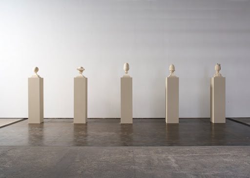 In the upstairs of the gallery, there are a series of small, temple like structures to walk in and also there are a series of five stone statues. The work, Five Finials, show’s five stone sculptures in an evolutionary state. Beginning with a circular sculpture and evolving to an orb, then developing into a cone shape and an acorn and then finally evolving into a grenade. Showing this progression of art as well as military is something that represents the evolution of man kind, warfare and the distance we have set between our society and that of antiquity. Seemingly only statues, these little sculptures possess a meaning that hides behind the innocuous, seemingly harmless guise of being only statues, but they are much more than that, commenting on politics, society and classicism.