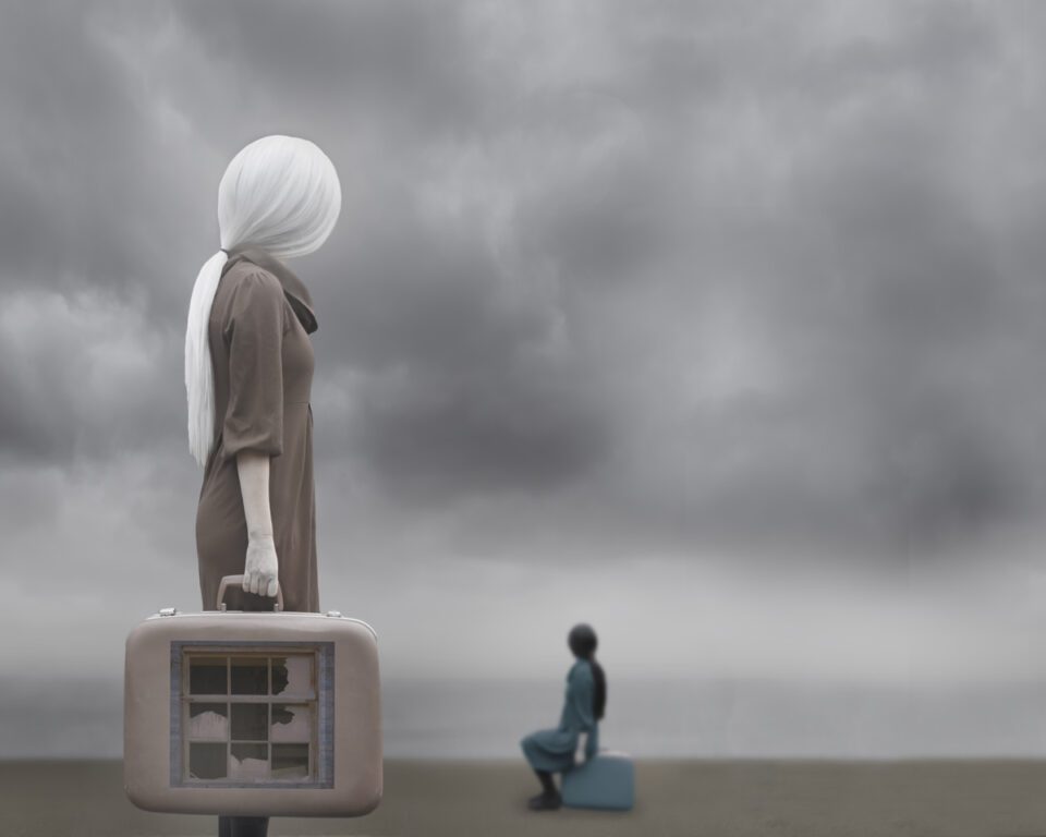 Anonymous characters stand transfixed upon unknown entities in the distance, locked within a state of contemplation. “Each photo depicts characters engaged in the internal world of these spaces through metaphor and surreal narrative,” Maher explains, pointing viewers towards compelling inner journeys.