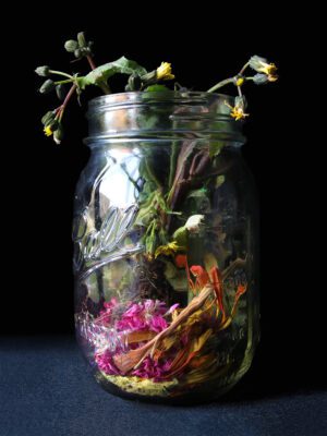 Contemporary artist Stephen Johnston continues the rich tradition of memento mori, with paintings that focus on food and flowers decomposing in jars.