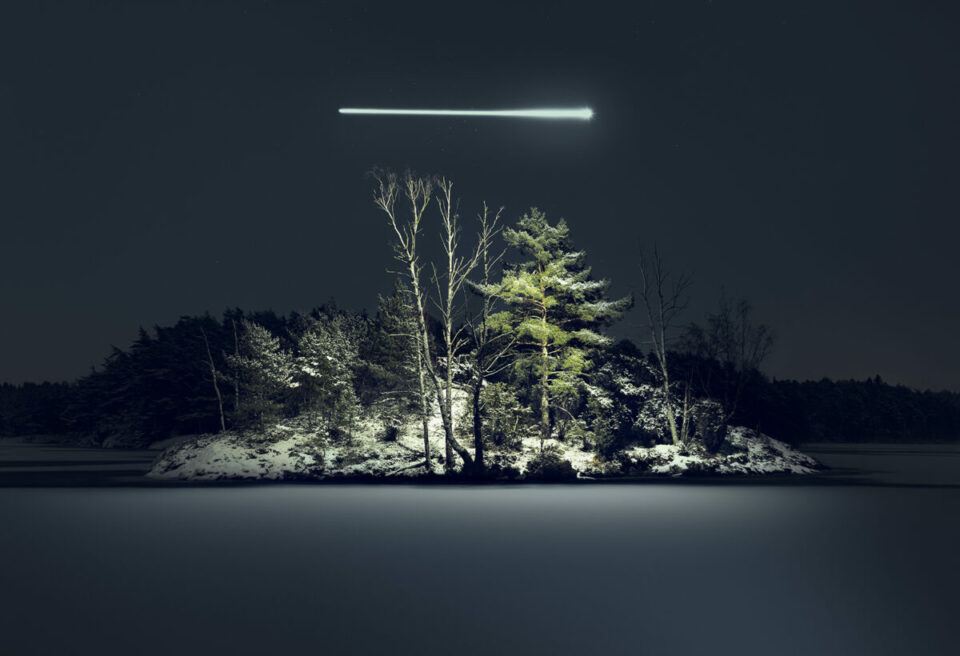 Shafts of light and glowing focal points are characteristic of many 19th century Romantic landscape paintings. The work of Francis Danby (1793-1861) is one such example; the Irish artist is remembered for producing dramatic Biblical scenes and apocalyptic views. Danby’s depictions of shipwrecks, flooding and doom were often accompanied by a lightning strike, or a radiant, blazing sun, and have been compared to similar pictures by the more widely-known John Martin (1789-1854). His The Great Day of His Wrath (1853), was, according to Martin’s son, based on a night journey through the Black Country. Fast-forward to 2024, and creatives are still grappling with nature and the sublime. Daniel Grizelj draws inspiration from classical paintings. In his photographs, focused light is essential – whether it appears from beneath branches, rocks or snowy peaks. Here, the Gothenburg-based artist invites us to take a walk after dark, traversing forests and eerie fields blanketed in show. Grizelj harnesses deep shadow as a way to “lead the observer through a maze of the subconscious and the imaginative, where the illumination is the opening.”